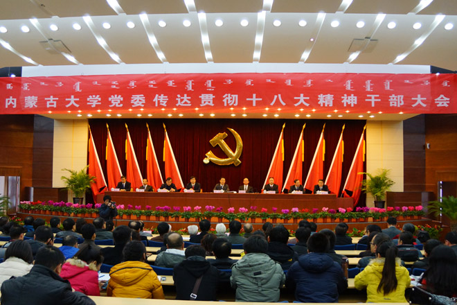 在全校干部大會上,侯元書記介紹了黨的十八大盛況;傳達了十八大的重要精神,并結合實際對十八大報告重要內容進行了解讀;傳達了內蒙古自治區(qū)黨委書記胡春華在黨的十八大內蒙古代表團全體會議上的講話精神和教育部黨組關于教育系統(tǒng)認真學習貫徹黨的十八大精神的通知精神。