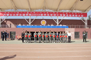 2013年9月5日,為期12天的內(nèi)蒙古大學(xué)交通學(xué)院2013級(jí)新生軍訓(xùn)圓滿(mǎn)結(jié)束并在南校區(qū)操場(chǎng)舉辦新生軍訓(xùn)匯操暨表彰大會(huì)。中國(guó)人民解放軍駐內(nèi)蒙古大學(xué)后備軍官選培辦主任胡成,內(nèi)蒙古大學(xué)學(xué)工處副處長(zhǎng)(團(tuán)委副書(shū)記)武裝部副部長(zhǎng)海光,學(xué)院常務(wù)副院長(zhǎng)董平,黨委副書(shū)記、紀(jì)委書(shū)記、軍訓(xùn)工作領(lǐng)導(dǎo)小組組長(zhǎng)白托婭,副院長(zhǎng)孫恒,副院長(zhǎng)武鈞和各系黨總支書(shū)記出席表彰大會(huì)并在主席臺(tái)就坐。學(xué)工處副處長(zhǎng)、團(tuán)委副書(shū)記高飛主持大會(huì)。