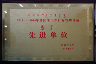 大會(huì)對(duì)2013-2014年度團(tuán)學(xué)工作目標(biāo)管理評(píng)估的優(yōu)秀學(xué)院及內(nèi)蒙古大學(xué)第四屆“十大杰出青年(團(tuán)體)”進(jìn)行了表彰。我院獲得了“內(nèi)蒙古大學(xué)2013-2014年度團(tuán)學(xué)工作優(yōu)秀學(xué)院”榮譽(yù)稱號(hào)。