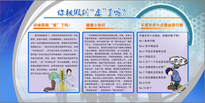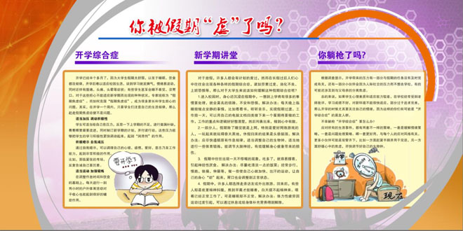 針對部分學生的“開學綜合癥”問題,學工處(團委)通過宣傳展板,引導學生積極調(diào)整學習時間,樹立學習目標,促使學生盡快進入學習狀態(tài)。